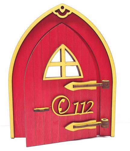 Preview: Tanno Design beliebteste Feuerwehr Wichtel, Wichteltür, Feentür, Mäusetür aus Holz zum öffnen mit echtem Wichtel rot/gelb 17cm