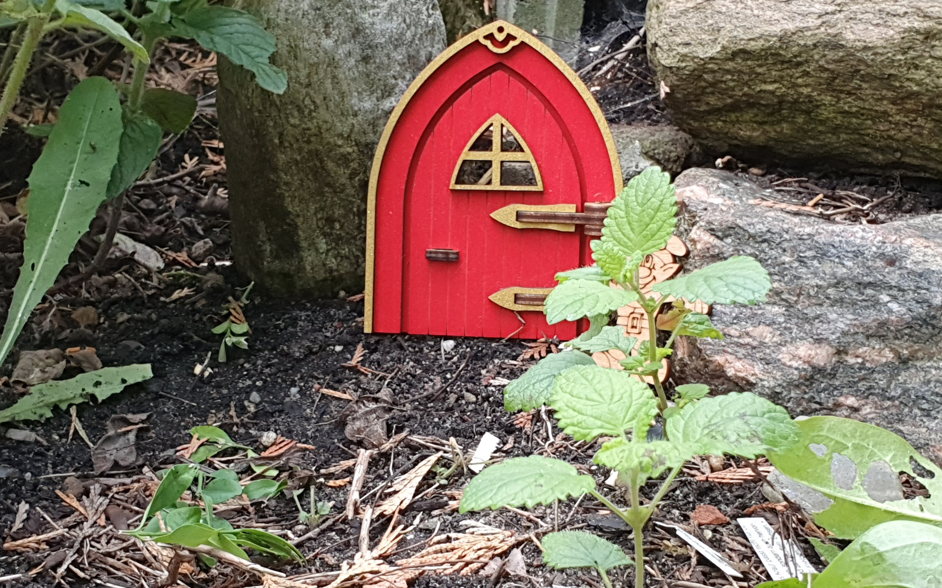 Tanno Design beliebteste Mini Wichteltür, Feentür, Mäusetür aus Holz zum öffnen mit echtem Wichtel_rot/gold 10 cm