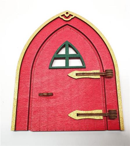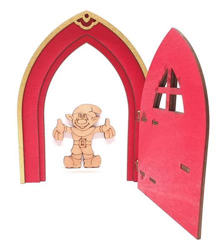 Preview: Tanno Design beliebteste Mini Wichteltür, Feentür, Mäusetür aus Holz zum öffnen mit echtem Wichtel_rot/gold 10 cm