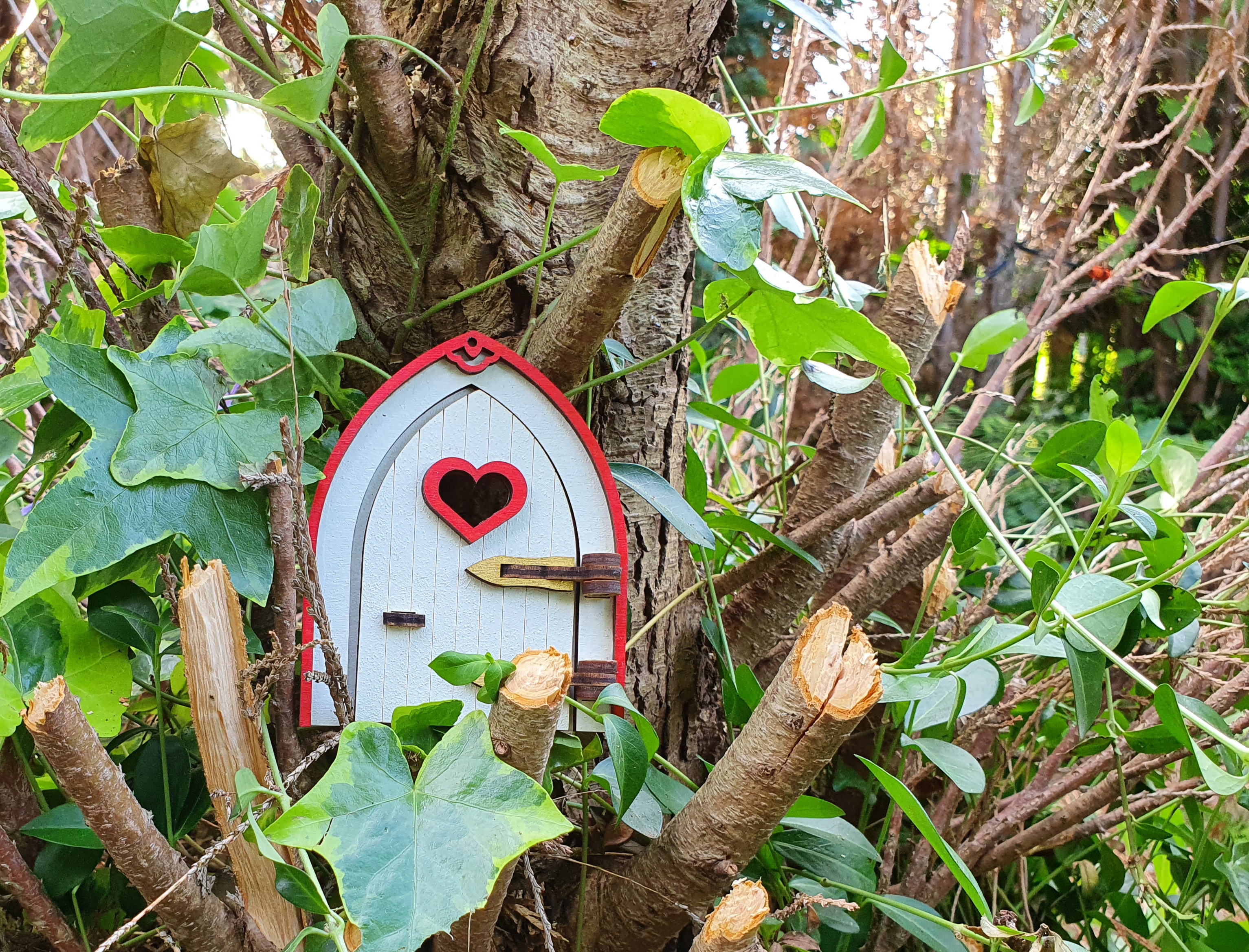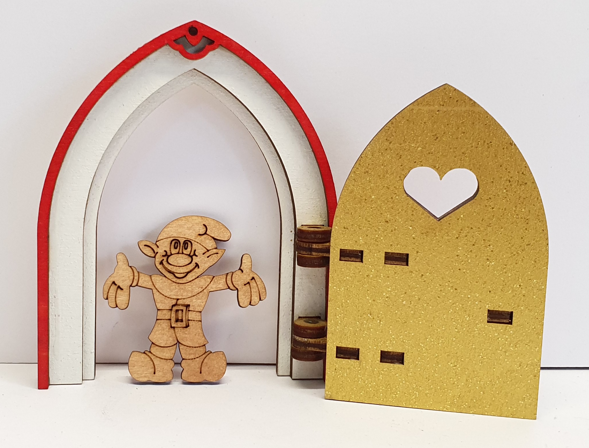 Tanno Design beliebteste Mini Wichteltür, Feentür, Mäusetür aus Holz zum öffnen mit echtem Wichtel weiß/rot/gold 10 cm