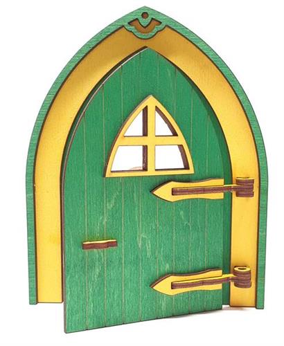 Preview: Tanno Design beliebteste Wichteltür, Feentür, Mäusetür aus Holz zum öffnen mit echtem Wichtel grün/gelb 17cm