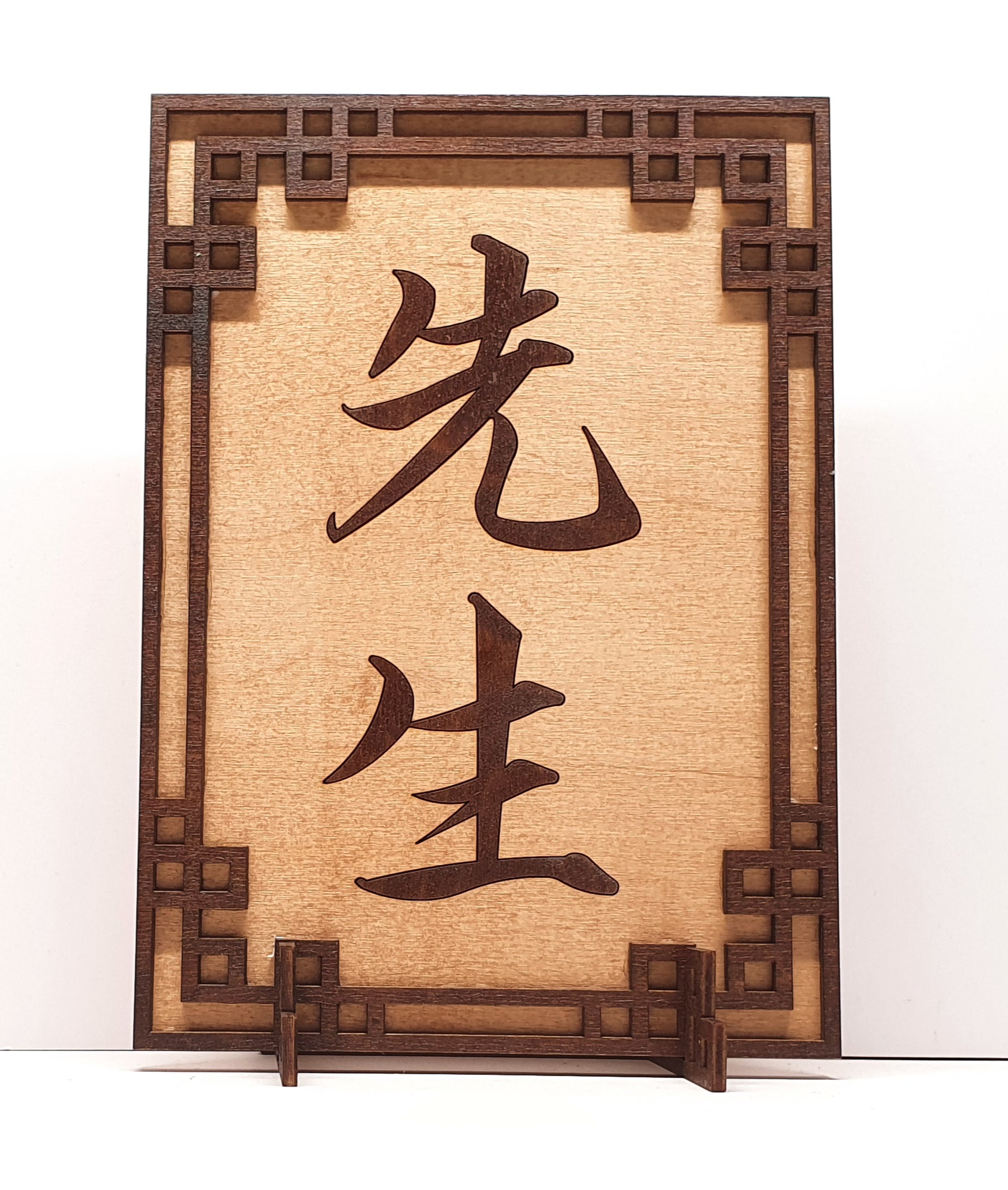 Mobile Preview: Tanno Design® Japan Stand- und Wandbild  mit Kanji 03 - Sensei -  Handarbeit Holz in Holz Birnbaum / Nussbraun