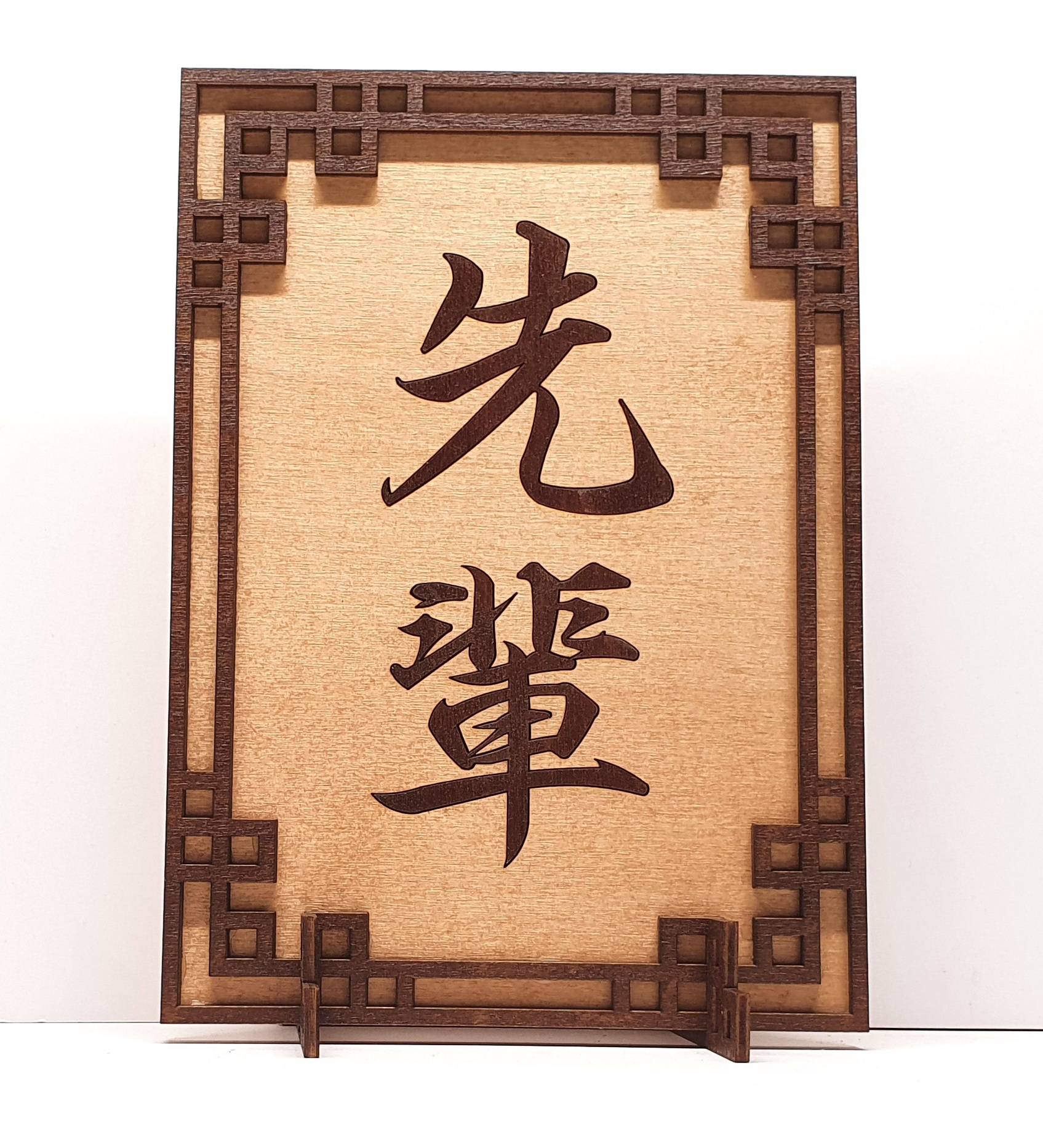 Preview: Tanno Design® Japan Stand- und Wandbild mit Kanji 04 - Sempai -  Handarbeit Holz in Holz Birnbaum / Nussbraun