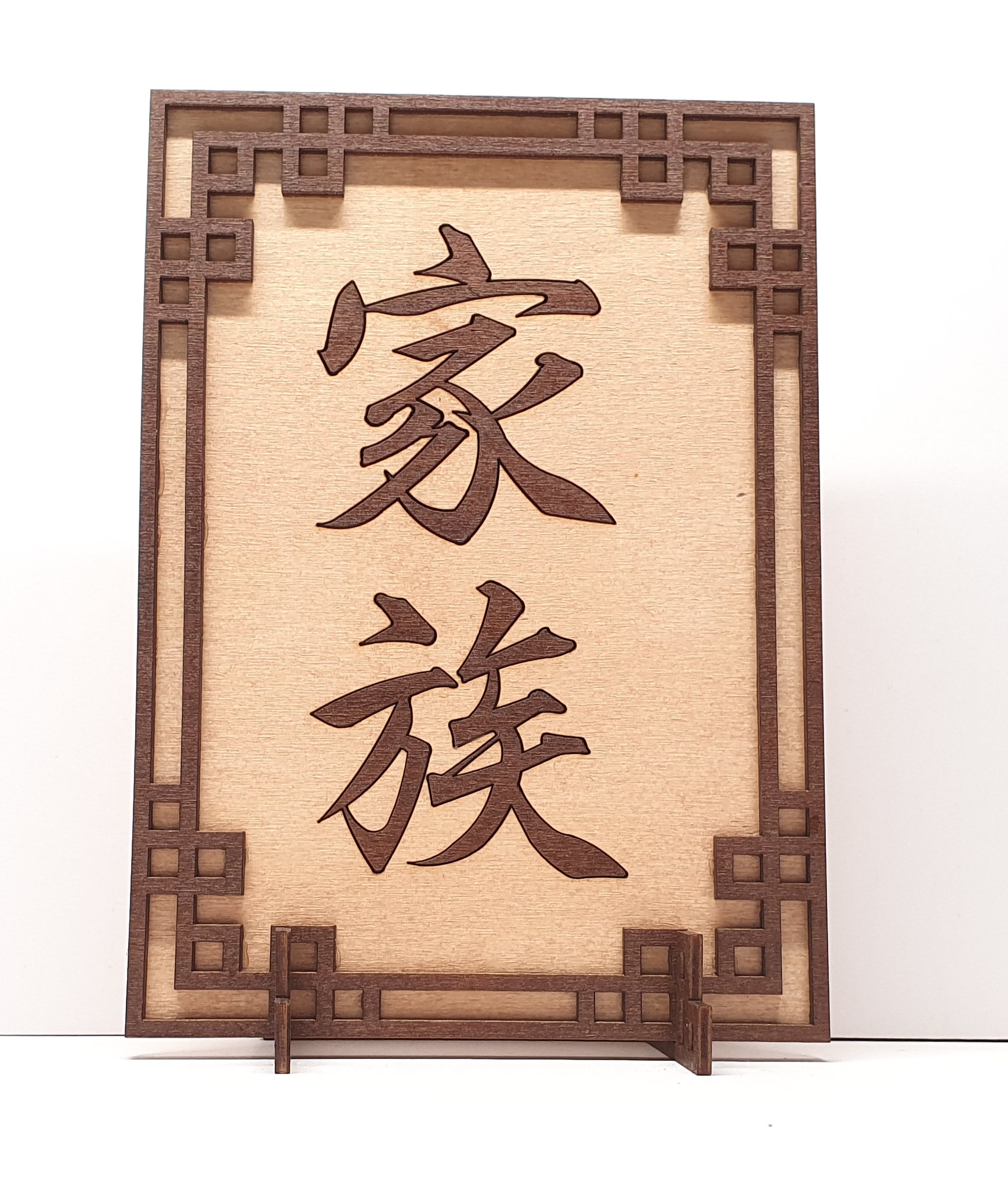 Tanno Design® Japan Stand- und Wandbild mit Kanji 12 - Familie - Handarbeit Holz in Holz Birnbaum / Nussbraun