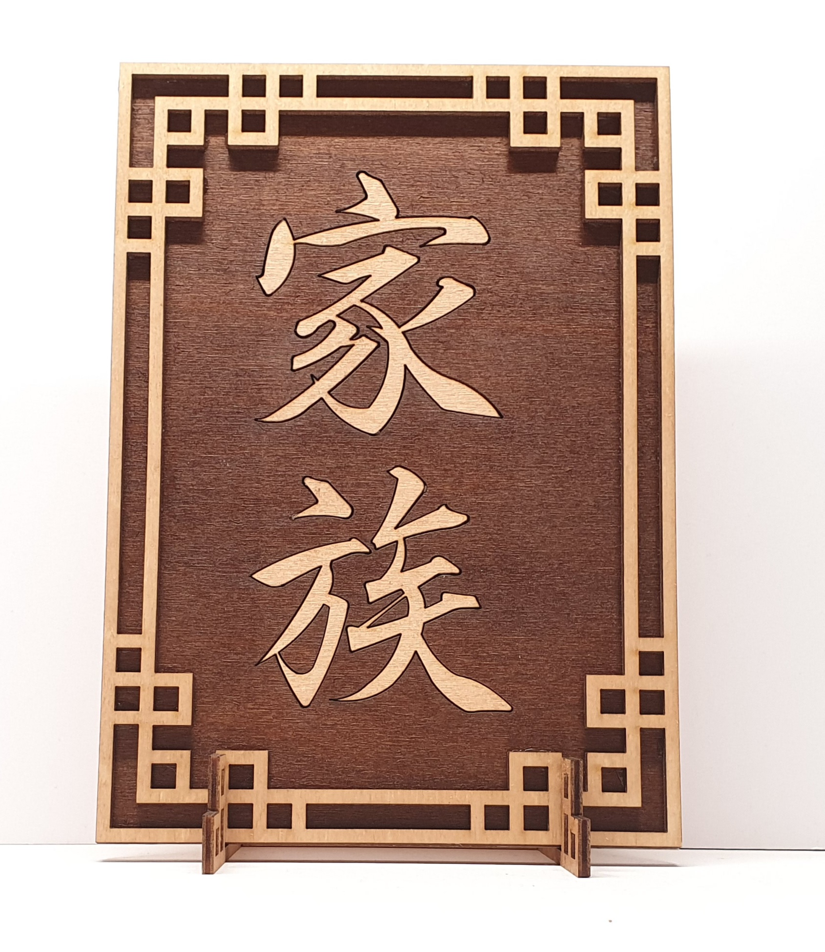 Preview: Tanno Design® Japan Stand- und Wandbild mit Kanji 12 - Familie - Handarbeit Holz in Holz Nußbraun / Birnbaum