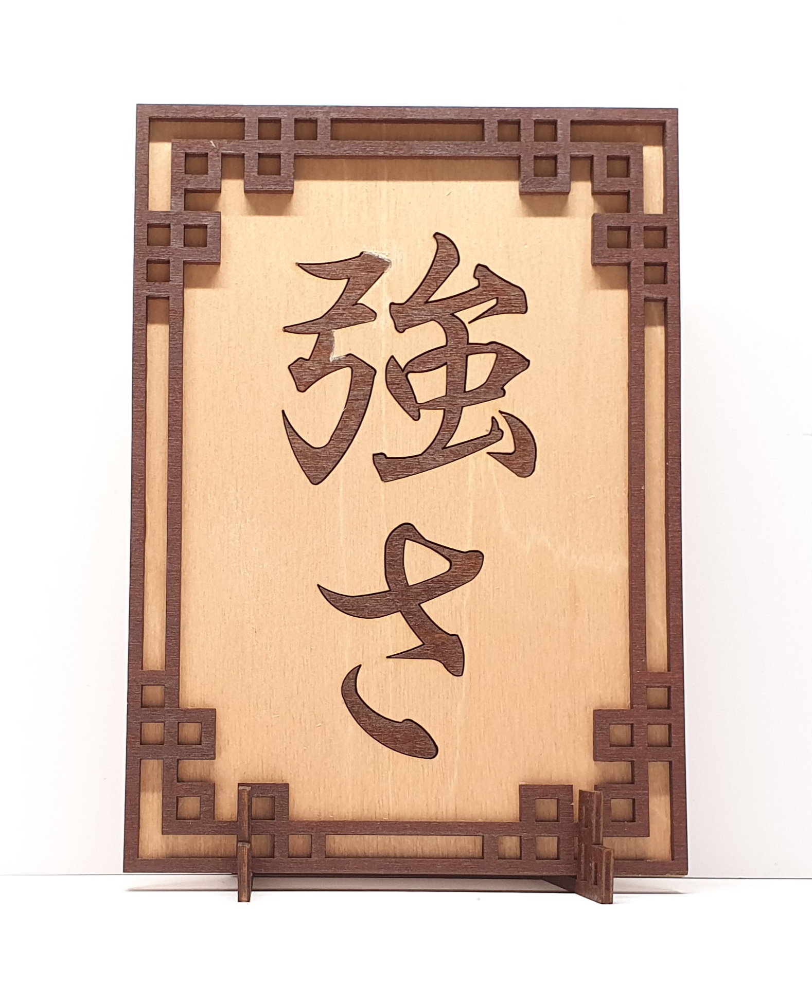 Preview: Tanno Design® Japan Stand- und Wandbild mit Kanji 33 - Stärke - Handarbeit Holz in Holz Birnbaum